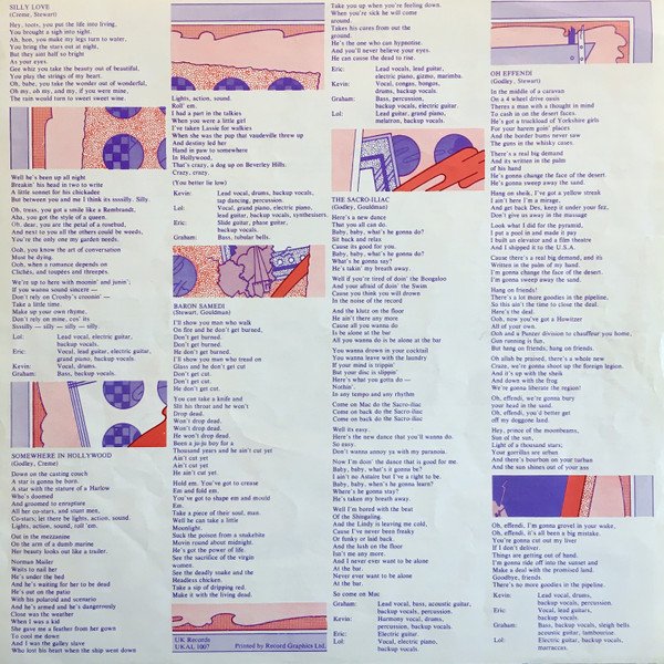 Recorded at Strawberry Recording Studios (UK) Ltd., Stockport, Cheshire, England. Master cut at Sterling Sound, New York City, USA. 'Insert Included' printed on rear cover under Cat. No. - 12" single sheet with lyrics and individual song credits [Printed by Record Graphics Ltd] UK Records, Decca House 9, Albert Enbankment, London SE1 7SW. ℗ © 1974, Strawberry Productions Made in England. This UK pressing has light blue centre labels and dark blue text. Of note is that the labels are smaller than the label area on the vinyl, a given that is known from pressings by [l96171]. Small label - Ø3.625" (91 mm)