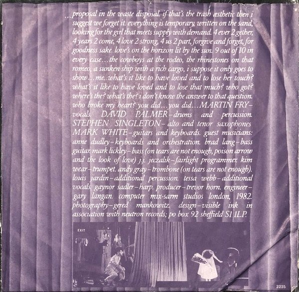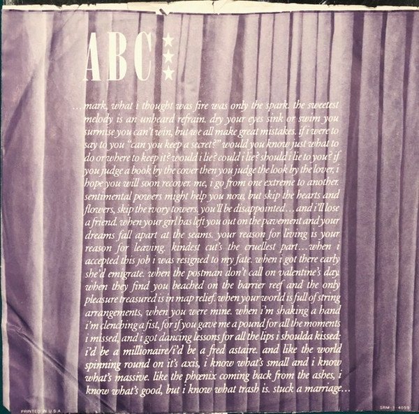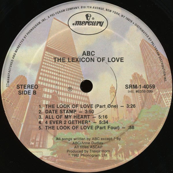 Computer Mix - Sarm Studios London, 1982. Back Cover: (6359 099) ©℗ 1982 Phonogram Ltd. A4 ℗ 1981 Phonogram Ltd. Manufactured and Marketed by PolyGram Records, Inc., 810 Seventh Avenue, New York NY 10019 Printed in U.S.A. Also available on Cassette (MCR-4-1-4059) An [url=http://www.discogs.com/ABC-The-Lexicon-Of-Love/release/438698]alternate issue[/url] exists with same catalogue number but with different font & layout on labels. Runouts are etched, except "STERLING" is stamped.