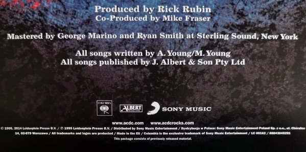 180 gram black vinyl, housed in heavy gauge protective printed inner sleeve with pictures, credits & liner notes. On back cover : © 1995, 2014 Leidseplein Presse B.V./ ℗ 1995 Leidseplein Presse B.V. / Distributed by Sony Music Entertainment / Dystrybucja W Polsce: Sony Music Entertainment Poland SP. z o.o., ul. Chóralna 14, 02-879 Warszawa / All Trademarks And Logos Are Protected / Made In The EU / Columbia is the exclusive trademark of Sony Music Entertainment / LC 00162 / 88843049291 EU 2022 repress of [url=https://www.discogs.com/release/16623936-ACDC-Ballbreaker]Ballbreaker[/url]. Runouts are etched, only the MPO Logo and the following stamper numbers are stamped.