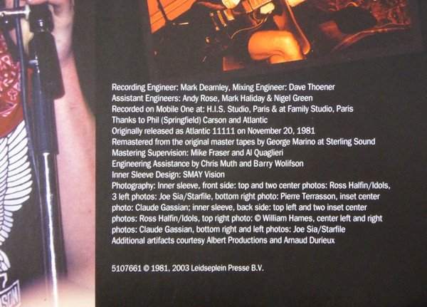 Reissue from 2009, identified by the matrix number. Sony Music logo without brushstroke, printed on the back of the cover and the label. Gatefold cover with embossed artwork, text on front and title on rear. Including a printed cardboard inner sleeve with liner notes and photos. Runouts are etched. [On back cover:] Remastered from the original master tapes at Sterling Sound. [...] © 1981, 2003 Leidseplein Presse B.V. / ℗ 1981 Leidseplein Presse B.V. [...] Made in the EU. [...] "Columbia is the exclusive trademark of Sony Music Entertainment" [...] [On inner sleeve:] [...] Originally released as Atlantic 11111 on November 20, 1981 [...] Additional artifacts courtesy Albert Produktions and Arnaud Durieux.