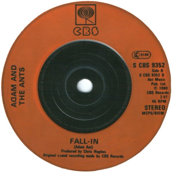 Issued in a side opening flipback card sleeve with a light gloss finish and with a die cut thumb section. Copyright warnings are moulded at the circumference of the centre hub. Gripper rings are moulded at the circumference of the labels. B-side is listed as "Fall In" on the cover. "Unplug the jukebox and do us all a favour that music's lost its taste so try another flavour -ANTMUSIC!" "Antmusic" from LP "[url=http://www.discogs.com/release/399637]Kings Of The Wild Frontier[/url]" CBS 84549 A: EMI Music Pub. Ltd. B: Ant Music Pub. Ltd. Original sound recording made by CBS Records. ℗ 1980 CBS Records © 1980 CBS Records "Made in England".