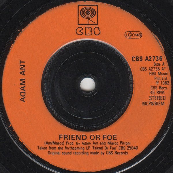 Orange injection labels. Also available with [url=http://www.discogs.com/release/2828975]orange sunburst paper labels[/url]. From the forthcoming album by Adam Ant "[m=74832]", available from Monday October 11th, 1982 A: © EMI Music Publishing Ltd. 1982 B: © Antmusic Ltd. 1982 ℗ 1982 CBS Recs. Original sound recording made by CBS Records