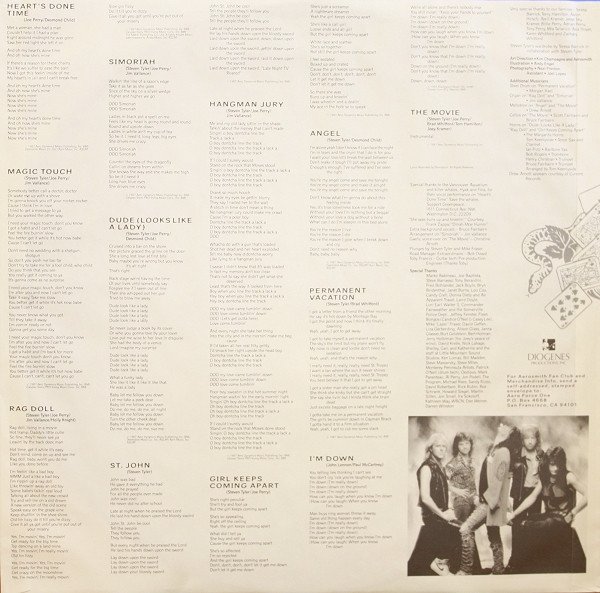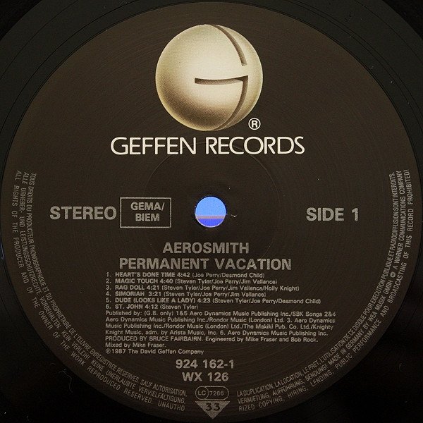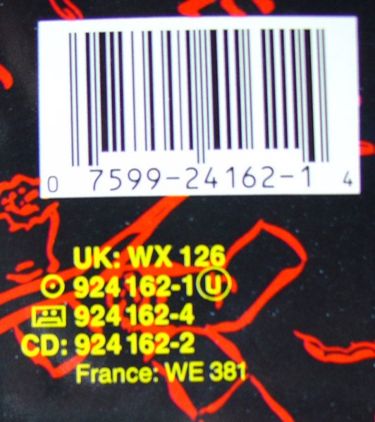 Direct Metal Mastering (DMM). A version pressed with Lacquer Cut By [a=JK (28)] from the US is: [r26369573] Includes a printed inner sleeve with pics, lyrics and credits On back cover: Originally Mastered at Sterling Sound Recorded at Little Mountain Sound Studios, Vancouver, B.C., Canada Manufactured exclusively by Warner Bros. Records Inc., a Warner Communications Company © ℗ 1987 The David Geffen Company Manufactured in Germany by Record Service GmbH, Alsdorf - Pressé en Allemagne par Record Service GmbH, Alsdorf On labels: Made in Germany by WEA Musik GmbH Publishers (GB only): Tracks A1, A5, B3 Aero Dynamics Music Publishing Inc. / SBK Songs Tracks A2, A4, B1 Aero Dynamics Music Publishing Inc. / Rondor Music (London) Ltd Track A3 Aero Dynamics Music Publishing Inc. / Rondor Music (London) Ltd / The Makiki Pub. Co. Ltd. / Knighty-Knight Music, adm. by Arista Music, Inc. Track A6, B2, B4, B6 Aero Dynamics Music Publishing Inc. Track B5 Northern Songs On inner sleeve: Tracks A1, A5, B3 © 1987 Aero Dynamics Music Publishing Inc. BMI / Desmobile Music Co., Inc. / April Music, Inc. ASCAP Tracks A2, A4, B1 © 1987 Aero Dynamics Music Publishing Inc. BMI / Calypso Toonz PRO / Irving Music Corp., Inc. BMI Tracks A3 © 1987 Aero Dynamics Music Publishing Inc. BMI / Calypso Toonz PRO / Irving Music Corp., Inc. BMI / The Makiki Pub. Co. Ltd. / Knighty-Knight Music, administrated by Arista Music, Inc. ASCAP Track A6, B2, B4, B6 © 1987 Aero Dynamics Music Publishing Inc. BMI Track B5 © 1965 Blackwood Music Inc. under license from ATV/MacLen BMI Special thanks to the Vancouver Aquarium and killer whales, Hyak and Fina, for their vocal performance on "Heart's Done Time". Save the whales. "She was buns up and kneelin'" courtesy of [a92623] / "Dina-Moe-Humm" Drew Arnott appears courtesy of [l856759]. Notes on runouts: - "R / S Alsdorf 924162-1-A" & "R / S Alsdorf 924162-1-B2" are machine-stamped, all else is hand-etched.