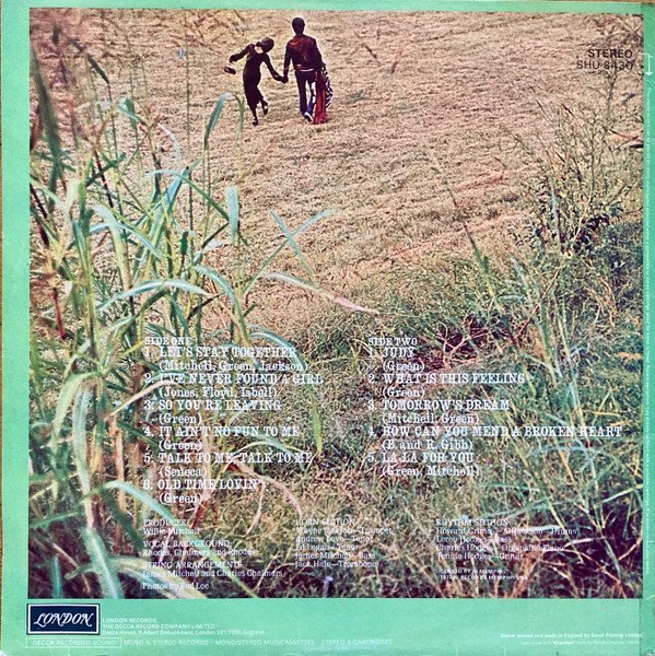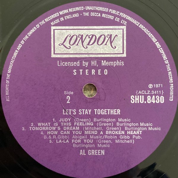 Original UK stereo release in front-laminated cover, on plum London labels. Poly-lined Decca 'blue stereo box'-inner sleeve with 'Made In England' and 'Patent No. 1,072,844'. First catalogue number on cover, 2nd on labels. ℗ 1971 © 1972 Hi Records Memphis USA MS The Memphis Sound Decca Recorded Sound [boxed]. Sleeve printed and made in England by Senol Printing Limited. Laminated with 'Clarifoil' made by British Celanese Limited Made In England This release has 11 tracks, compared to the original US release with different track order and 9 tracks only (missing A5 & B3). Published by Burlington Music, except A5: Carlin Music, B4: Abigail Music/Robin Gibb Pub. Similar to [r=5310894], but with different label design. [r=1949595] is a slightly later reissue. Runouts are stamped.