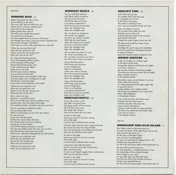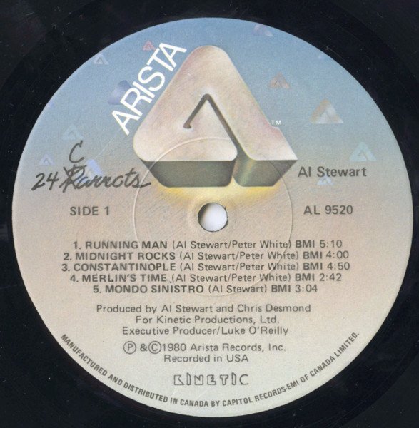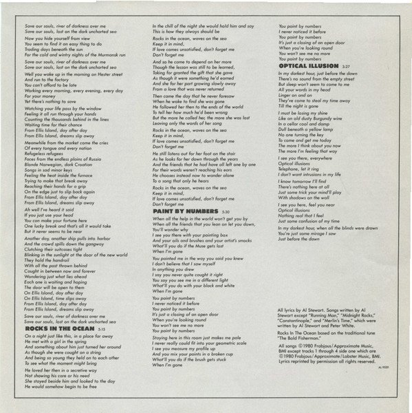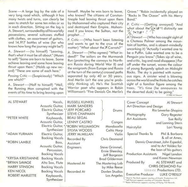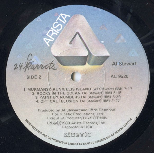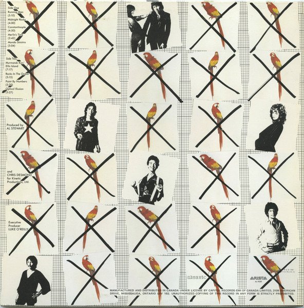 Came with printed inner sleeve and lyric insert. The inner sleeve also reads Al Stewart & Shot In The DarkManufactured And Distributed In Canada By Capitol Records-EMI Of Canada Ltd."(ER) PRINTED IN CANADA" near the bottom of the spine.