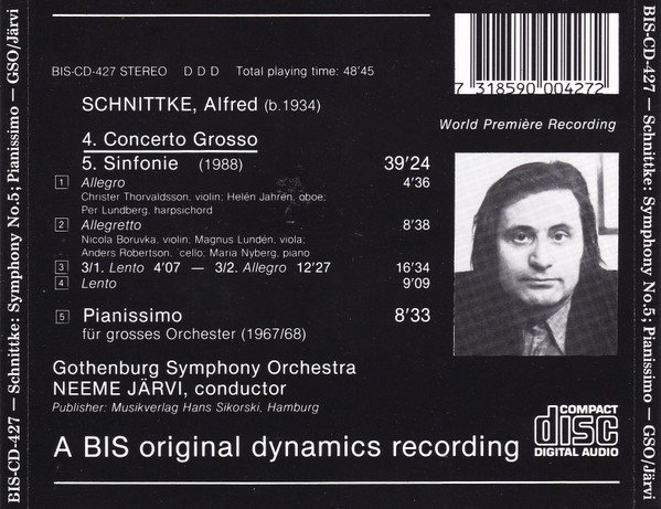 World première recordings of 4. Concerto Grosso - 5. Sinfonie (1988) and Pianissimo für grosses Orchester (1967/68). Recording data: 1988-12-01/02 at the Gothenburg Concert Hall, Sweden Publisher: Musikverlag Hans Sikorski, Hamburg © & ℗ 1988, Grammofon AB BIS Printing: West Germany 1988 Made in Austria by DADC - This version has SID codes.