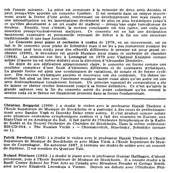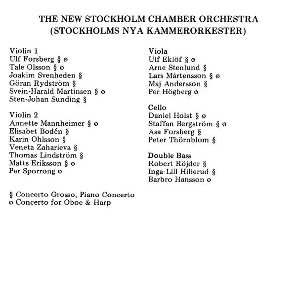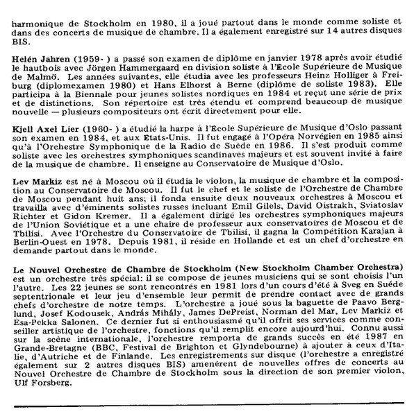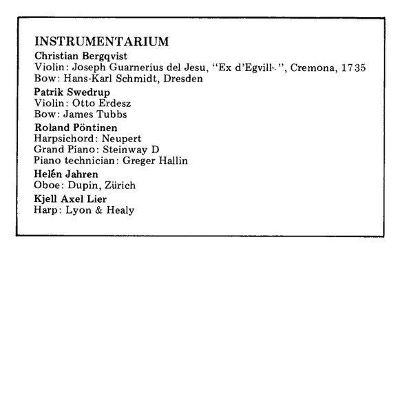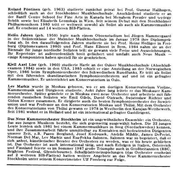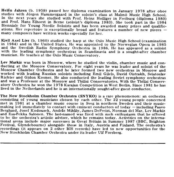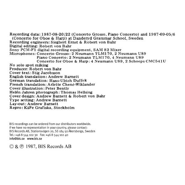 Recorded August 20/22, 1987 (tracks 1 to 6 & 8) and September 5/6, 1987 (track 7) at Danderyd Grammar School, Sweden. Recording equipment used: Sony PCM-F1 digital recording equipment, SAM 82 mixer Microphones: Concerto Grosso: 2 Neumann TLM170, 2 Neumann U89 Piano Concerto: 2 Neumann TLM170, 4 Neumann U89 Concerto for Oboe & Harp: 4 Neumann U89, 2 Schoeps CMC541U No solo spot miking. © & ℗ 1987, Grammofon AB BIS 16-page booklet in English, German and French.