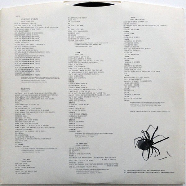 Original UK release in fully-laminated cover, on black Anchor labels with 'Black Widow'-logo, pressed by EMI Records. Top-opening shaped cardboard inner sleeve with a thumb cut-out, containing lyrics, photos and credits. Recorded At: Soundstage, Toronto • Record Plant East And Electric Lady, N.Y. • A&R Studios, N.Y. ℗ & © 1975 Anchor Records Ltd. Outside Of U.S.A. And Canada, Publishing Rights Owned By Kru, Ltd. A Black Widow Inc. And Kru Ltd. Production All Songs Administered In U.S.A. And Canada By Ezra Music All Songs Administered In All Other Territories By Warner Bros. Music A3 appears as "The Black Widow" on cover and inner sleeve, but as "Black Widow" on label. Printed by James Upton Ltd., England Made In U.K. [labels] • There is a very similar EMI pressed release here [r=25729507] with 'Made In U.K.' on side B label only. USA Publishing, Copyright © 1975: • A1, A5, B3: Ezra Music / Early Frost • A2: Ezra Music / All By Myself / Freewheeled Music • A3, B1, B5: Ezra Music / Early Frost / All By Myself • A4: Ezra Music / Extragordonary / All By Myself • B2, B4: Ezra Music / All By Myself • B6: Ezra Music / Bad Boy Music/ Eighth Power Music Josef Chirowski Appears Through The Courtesy Of Columbia Records Of Canada Ltd. Runouts are stamped.