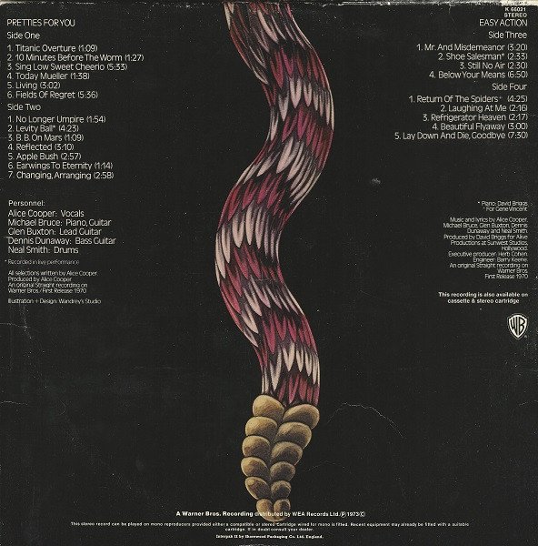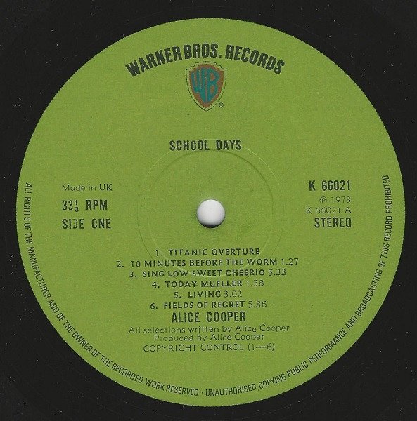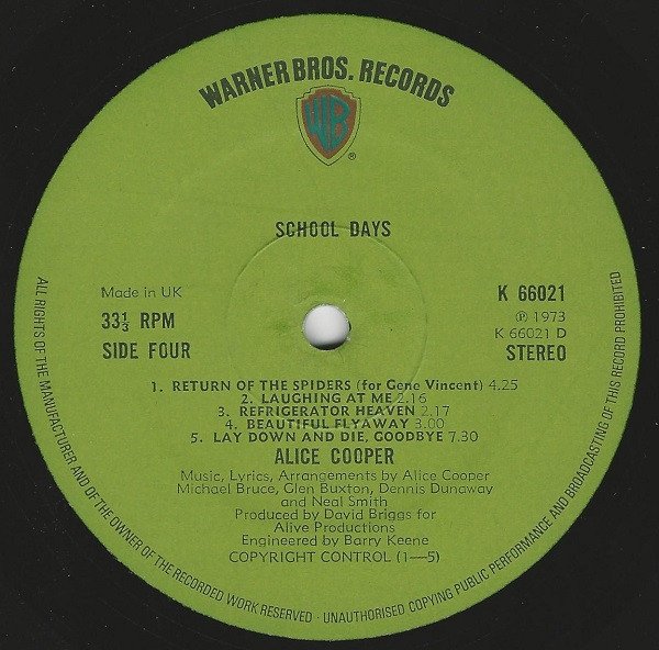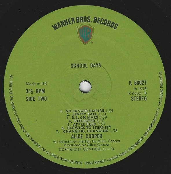 "Pretties For You" - An original Straight recording on Warner Bros./First Release 1970 Levity Bell recorded in live performance. "Easy Action" - Produced for Alive Productions at Sunwest Studios, Hollywood. An original Straight recording on Warner Bros Return Of The Spiders For [a=Gene Vincent]. First Release 1970. (P) (C) 1973 This edition has green labels and Copyright Control publishing credits. Editions with [url=https://www.discogs.com/release/11123014]Carlin Music Corp[/url] publishing credits and [url=https://www.discogs.com/Alice-Cooper-School-Days-The-Early-Recordings/release/7050001]illustrated labels with Copyright Control[/url] also exist.