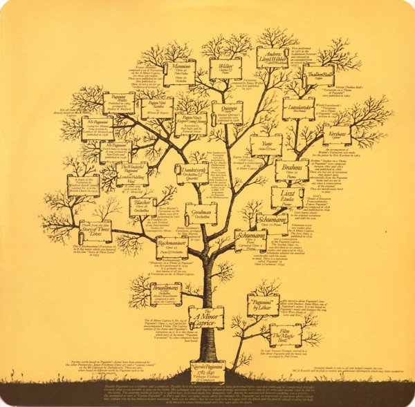Inner sleeve has credits and pictures of artists on one side and Paganini's Variations "Family tree" on the other side