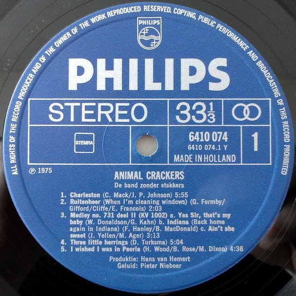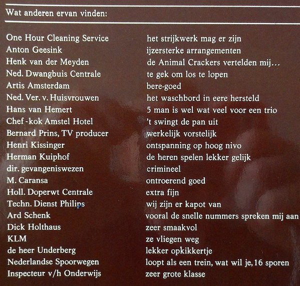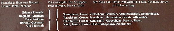 Instruments used are simply printed next to the artist names on the back cover; they have not been credited individually. [a=Sjef Van Oekel] is the voice over at the intro of side 1; also appears a few times in track A1. ℗ 1975 Made in Holland Printed in Holland