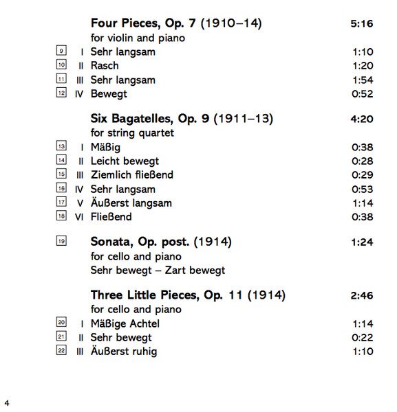 | Six Bagatelles, Op. 9 (1911-13) for string quartet | 4:20 | |