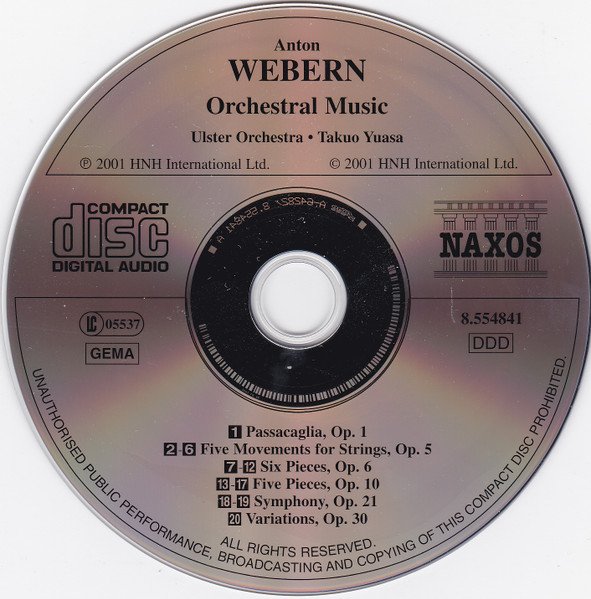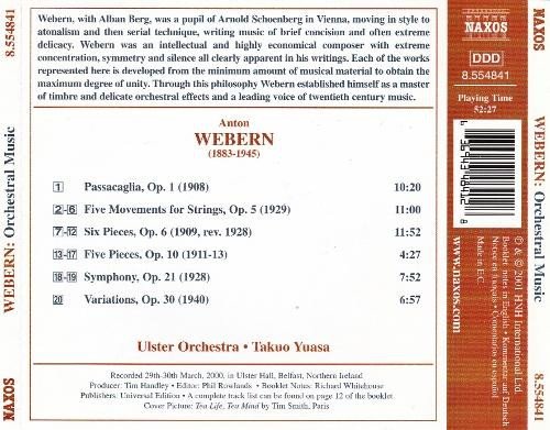 Recorded at the Ulster Hall, Belfast, Northern Ireland from 29th-30th March, 2000. Compilation: Op. 1, Passacaglia for orchestra (1908) Op. 5, Five Movements for string quartet (1909); version for string orchestra (1929) Op. 6, Six Pieces for large orchestra (1909–10, revised 1928) Op. 10, Five Pieces for orchestra (1911–13) Op. 21, Symphony (1928) Op. 30, Variations for orchestra (1940) Made in E.C.