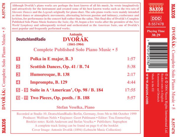 ℗ & © 2004. Made in the EU. Comes in a standard jewel case. 6pp booklet has notes in English & German. Playing time 38:29. Recorded 5-8 October, 1999 at Studio 10, DeutschlandRadio Berlin, Germany. Cover image: Antonín Dvořák (1894) (Lebrecht Music Collection)