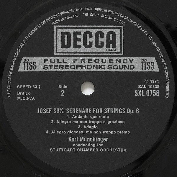 LABELS: - Black/silver 'narrow band' labels - Boxed Decca logo - Decca 'Musical Notes' logo on side 1 - "Made in England" - "℗ 1976 The Decca Record Co. Ltd." on side 1 - "℗ 1971" on side 2 SLEEVE: - Laminated on front only - Negative stereo Ⓢ on spine - Sleeve notes in English, French and German on back - Tracks A1 to A5 (Dvořák) recorded June 1975 in Ludwigsburg - Tracks B1 to A4 (Suk) recorded June 1971 in Ludwigsburg - "Made in England" - "℗ © 1976, The Decca Record Company Limited, London." - "Sleeve printed in England by Robert Stace" OTHER INFORMATION: - Labelography code: ED4 or ED5 - Tracks B1 to B4 (Suk) previously released on [url=http://www.discogs.com/Karl-M%C3%BCnchinger-Stuttgart-Chamber-Orchestra-Suk-Wolf-Richard-Strauss-Serenade-For-Strings-Italian-S/release/4590591]Decca SXL 6533[/url]