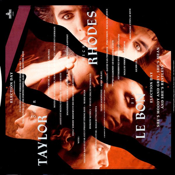 An alternative version of 'Election Day' will feature on the forthcoming Album 'So Red The Rose'. Recorded within Studio De La Grande Armee, Paris. Both sides published by Tritec Music Limited. ℗ 1985 Original Sound Recordings Made By Tritec Music Limited. © 1985 Tritec Music Limited. 2-digit numeric code on front cover reads: 02 16 12 38 44 50= T A Y L O R 50 30 44 22 24 52= R H O D E S 38 24 00 18 44 42= L E _ B O N 2-digit numeric code on A-side label reads: 24 38 24 20 02 32 44 42 00 22 16 12 = E L E C T I O N _ D A Y