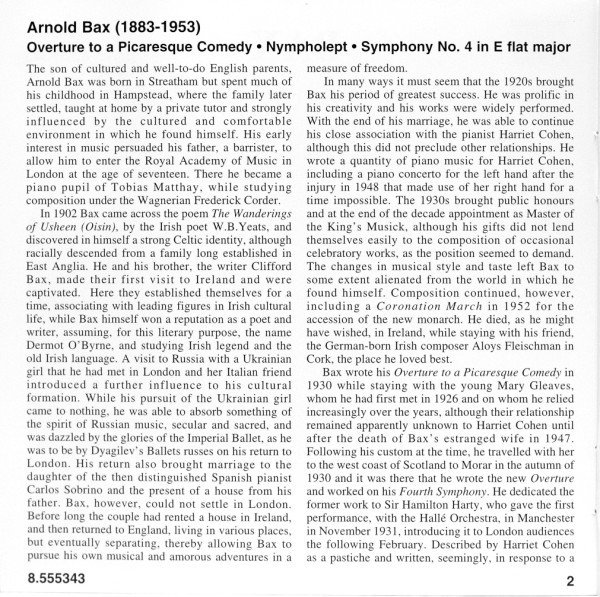 Recorded at the Henry Wood Hall, Glagow, Scotland, from 24th to 25th August 2000 8-page booklet with liner notes in English, German and French. ℗ & © 2002 HNH International Ltd. Made in E.C. Cover painting: “Morning, Derry Vard, 1906” by William Percy French (Bridgeman Art Library)