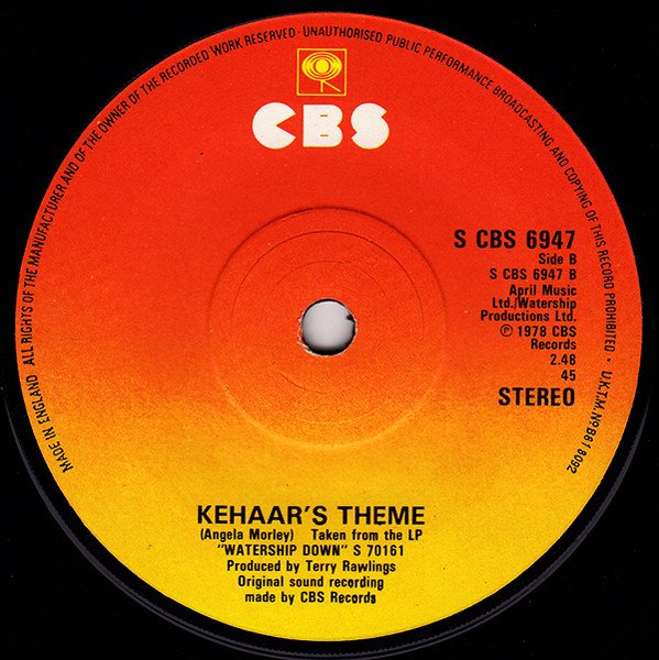 Made in England B-Side is an uncredited orchestration, Taken from the LP [url=http://www.discogs.com/Angela-Morley-Original-Soundtrack-Watership-Down/release/1908099]"Watership Down"[/url] S 70161. April Music Ltd./Watership Productions Ltd. ℗ 1978 CBS Records Original sound recording made by CBS Records. CBS Records, 17/19 Soho Square, London W1V 6HE Version in a CBS company sleeve and with solid centre. Also exist with [url=http://www.discogs.com/release/6422211]push-out centre[/url]. [r=850522] came in a picture sleeve.
