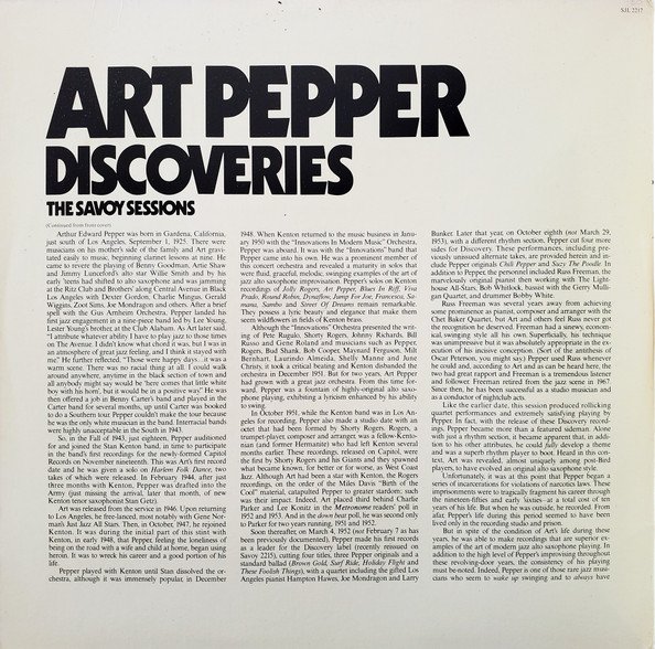 A1 to A4, B1 to B4: Los Angeles, October 8, 1952 A5, A6, B5, B6, C, D: Los Angeles, August 25, 1954 Material on the first two sides was previously issued on Savoy 12089 and Savoy 12215. The material on sides three and four is previously unissued. Mastered at Frankford-Wayne, New York.