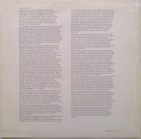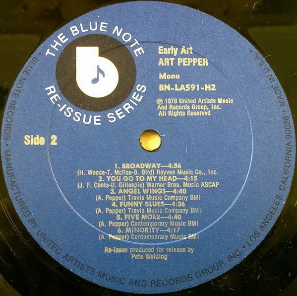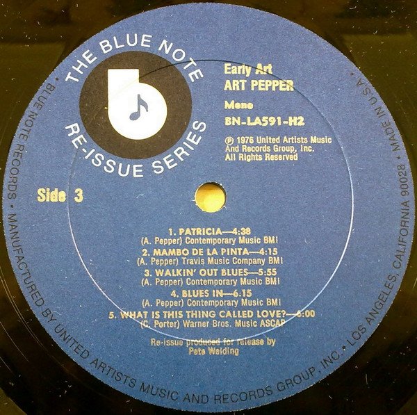 ——Recording info—— A1 to A5 recorded in Los Angeles, January 3, 1956 Originally issued as "Joe Morello Sextet" Intro LP ILP 608 later issue as "Art Pepper-Red Norvo Sextet" Score SLP 4031. (Note: Sixth member of the "sextet" was guitarist [a61587] who did not participate in the selections featuring Pepper.) A6 to C3 recorded in Los Angeles, August 1956 Originally issued as "Art Pepper Quintet" Jazz West LP 10, Score SLP 4032. (also on Blue Note CD "The Return Of Art Pepper") C4, D1, D2, D4 recorded in Los Angeles, December 28, 1956 C5, D3, D6 recorded in Los Angeles, January 14, 1957 Originally issued as "Art Pepper Quartet" Intro ILP 606, Score SLP 4030. Note that jazzdisco.org and Tom Lord's Jazz Discography have different recording information for some tracks: A1 to A5 were recorded on January 3, 1957, not 1956. Art Pepper made no recordings between July 1954 and July 1956 as he was in prison. A6 to C3 were recorded at Capitol Tower, Los Angeles, August 6, 1956 C4, C5, D2, D5, D6, were recorded at Radio Recorders, Los Angeles, on December 28, 1956 D1, D3, D4 recorded at Master Recorders, Los Angeles, January 14, 1957 ——Tracklist info—— As mentioned above, this LP is a two-disc Blue Note set that includes the complete tracks from "The Return of Art Pepper" and "Modern Art," plus five tracks from his January 1956 appearance on Joe Morello's (ds) album. However, despite being produced by Pete Welding, this Blue Note album mistakenly includes an alternate take of "Diane's Dilemma" instead of the song "Blues Out." Therefore, track D6 is "Diane's Dilemma (Alternate Take)." The listed "Blues Out" is incorrect. ——Center labels info—— Blue and white "Blue note Re-issue Series" labels ℗ 1976 United Artists Music And Records Group, Inc. ——Sleeve info—— Includes factory printed advertising inner sleeves Publishers: A1: Screen Gems-Columbia Music, Inc. BMI A2: Donaldson Publishing Co. ASCAP A3: Atlantic Music Corp. BMI A4, A5, B5 to C1, C3, C4, D1, D3, D6: Contemporary Music (2) BMI A6, B3, B4, C2: Travis Music Co. BMI B1: Rayven Music Co., Inc. B2, C5: Warner Bros. Music ASCAP D2: Chappell Music Co. ASCAP D4: Mills Music, Inc. ASCAP D5: Robbins Music Corporation ASCAP Gatefold cover. Runouts are etched except "Λ" is stamped.