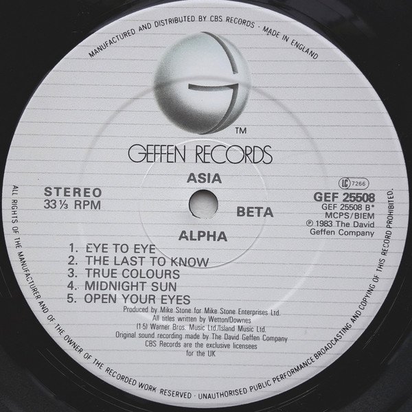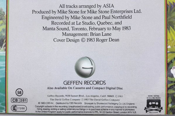 Original sound recording made by The David Geffen Company. Recorded at Le Studio, Quebec, and Manta Sound, Toronto, February to May 1983. Produced for Mike Stone Enterprises Ltd. Distributed by CBS Records. CBS Records are the exclusive licensees for the UK. All songs (C) 1983 WB Music Corp./Almond Legg Music Corp. Administered by WB Music Corp./Ackee Music Inc. ASCAP except "The Smile Has Left Your Eyes" (C) 1983 WB Music Corp./Almond Legg Music Corp. Administered by WB Music Corp. ASCAP All Rights Reserved. Used by permission. Unauthorized duplication is a violation of applicable laws. ⓒ ⓟ 1983 The David Geffen Company Cover Design ⓒ 1983 Roger Dean Issued in a single sleeve complete with a printed insert containing lyrics, credits and photographs. Has the symbol for Artisan Sound Recorders on the runout groove. CB 281 58