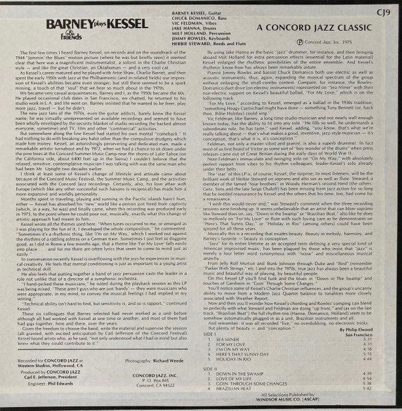 ℗ 1975 Concord Jazz, Inc. Title variations: - Spine, labels: Barney Plays Kessel - Front- & rearcover: Barney plays Kessel & Friends