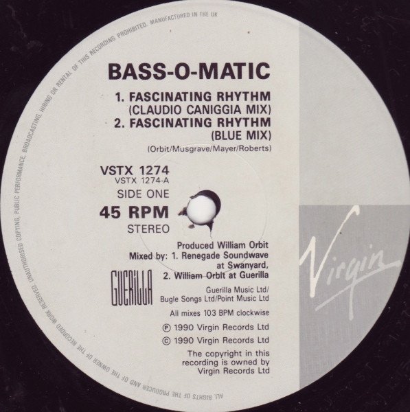 Produced and energized at Guerilla Studios, London. Track A1 mixed at Swanyard. Track A2, AA1 and AA1 mixed at Guerilla. All mixes 103 BPM clockwise. ℗ 1990 Virgin Records Ltd. © 1990 Virgin Records Ltd. Manufactured in the UK. Durations do not appear on release.