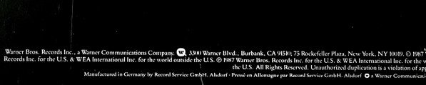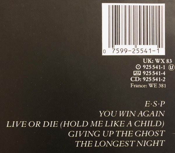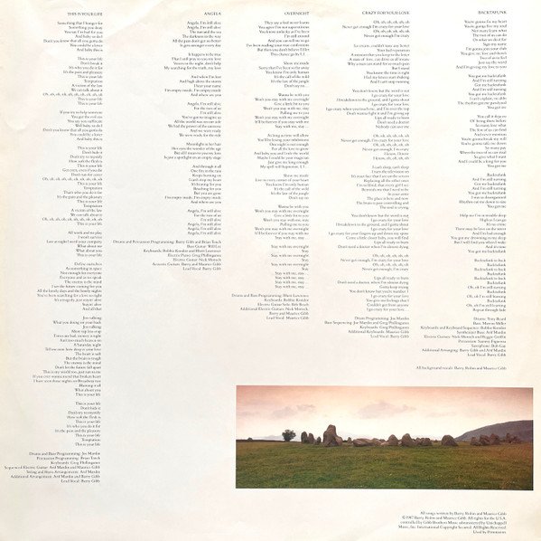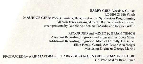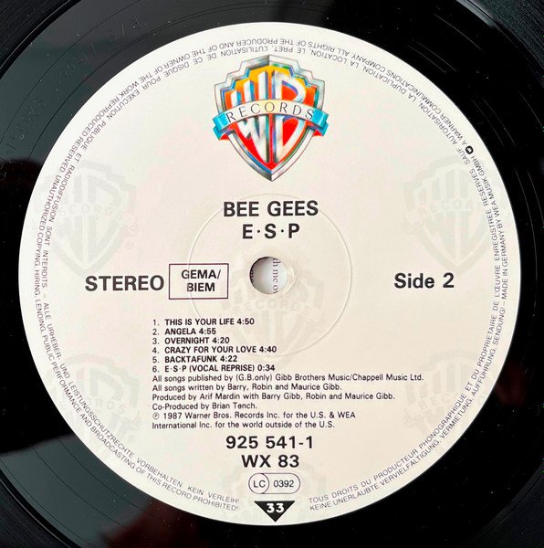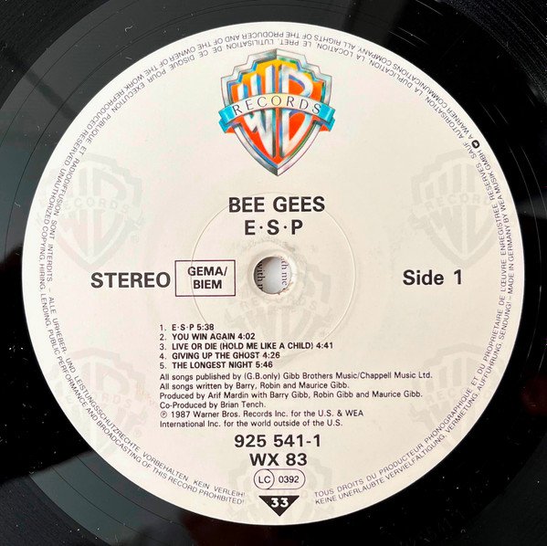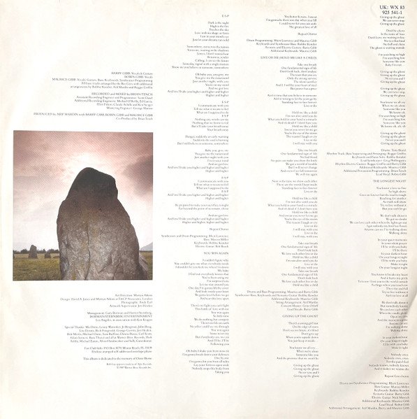Alternative front cover with E·S·P Bee Gees printed on the photo, right-hand side. Here is the version without it, where the same is printed in white letters above the photo: [r=519976] Issued with a printed inner sleeve containing lyrics, credits and images. [a323734] appears courtesy of [l61835] © 1987 [l90718] Direct Metal Mastering UK: WX 83 💿 925 541-1 Ⓤ 📼 925 541-4 CD: 925 541-2 France: WE 381 Manufactured in Germany by Records Service GmbH. Alsdorf ∙ Pressé en Allemagne par Record Service GmbH. Alsdorf W a Warner Communications Company ℗ 1987 Warner Bros. Records Inc. for the U.S. & WEA International Inc. for the world outside the U.S. Made in Germany [On inner sleeve]: © 1987 Barry, Robin and Marice Gibb. All rights for the U.S.A. controlled by Gibb Music administered by Unichapell Music, Inc [On spine]: UK: WX 83 925 541-1 On runouts "R/S Alsdorf 925541-1-A" side A, and "R/S Alsdorf 925541-1-B" side B, are stamped, everything else is etched.