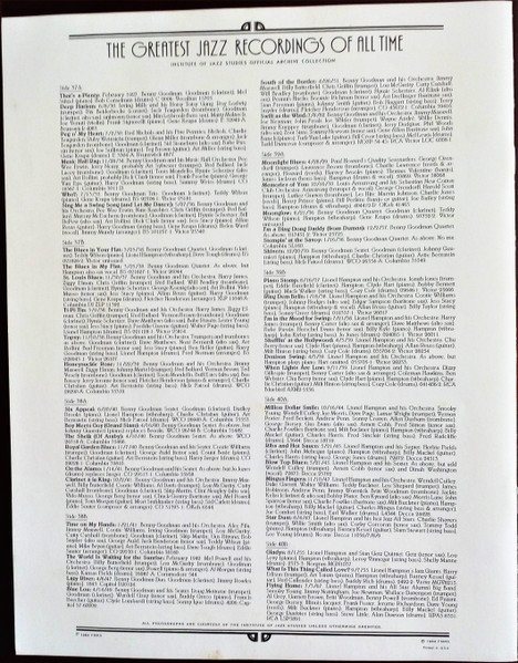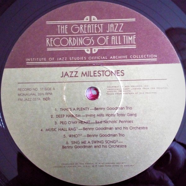 Made in Sweden. Booklet printed in U.S.A. with notes compiled by John McDonough. Spine reads:- Benny Goodman . Lionel Hampton / Jazz Milestones. Main artists taken from box. Track listing from labels or booklet. FMRS letter signed Stanley Walker, Vice President and Director. Box No.10, Records 37, 38, 39 and 40 of 25no. box, 100no. record series. Etched runouts for sides A and H read "JAZ7" rather than JAZZ.