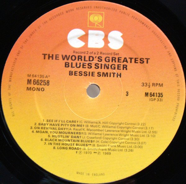 CBS sunset design labels, date unknown but probably mid to late 1970s. The original pressing of this would have been in 1970 and would have had the orange "one eye" labels. 662580 on sleeve (front, back and spine). M 66258 and (GP 33) on labels. This is the first of five two-record sets. This contains the first 16 and last 16 of her recordings. Issued in a gatefold sleeve. All selections were recorded in New York City.