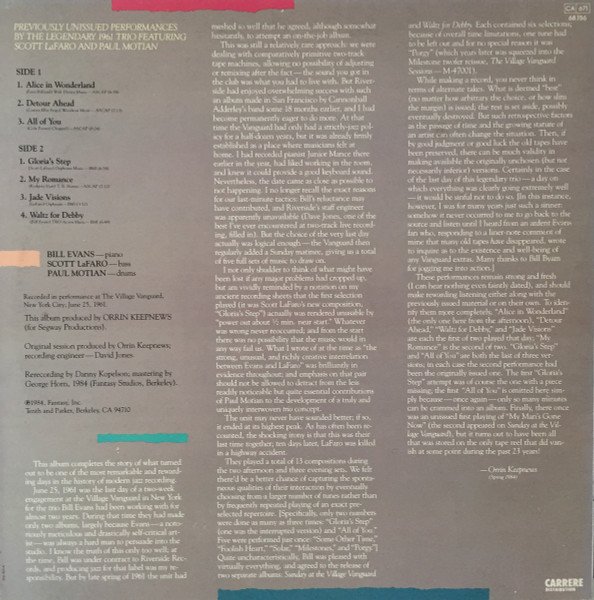 Recorded in performance at the Village Vanguard, New York City; June 25, 1961 Ⓟ 1984 Fantasy, Inc. Runouts are etched. Publishers and rights: A1, Walt Disney Music. ASCAP A2, Woodrow Music, ASCAP A3, Chappell, ASCAP B1, Orpheum Music, BMI B2, T.B. Harms, ASCAP B3, Orpheum Music, BMI B4, TRO-Acorn Music, BMI