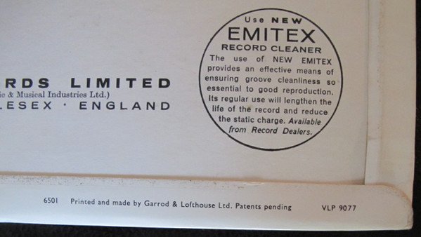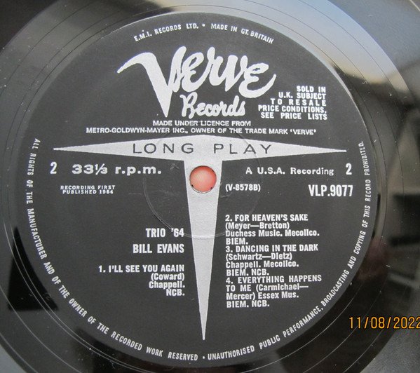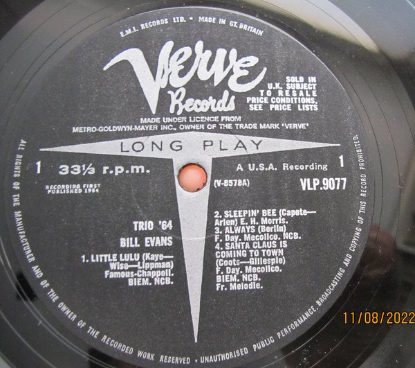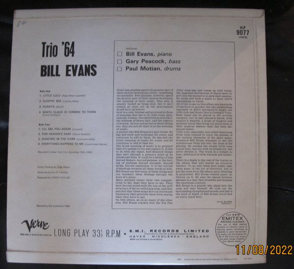 Trio 64 / Trio '64. Bill Evans with Gary Peacock, bass, Paul Motian, drums. Recording first published in 1964 Verve TRADE MARK OF METRO-GOLDWYN MAYER INC. Made and printed in Great Britain Flip sleeve 6501 Printed and made by Garrod and Lofthouse Ltd. Patents Pending VLP 9077 Label E.M.I. RECORDS LTD. * MADE IN GT BRITAIN (R/H) SOLD IN U.K. SUBJECT TO RESALE CONDITIONS SEE PRICE LISTS