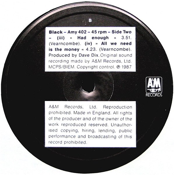 Original sound recording made by A&M Records Ltd. A1, B1 & B2: Copyright Control. A2: Published by Warner Bros. Music Ltd. ℗ 1987 A&M Records, Ltd. © 1987 A&M Records, Ltd. Made in England. Printed track times for tracks A2 & B1 are incorrect. A2 listed as 4:47, B1 listed as 3:51. Actual times listed in tracklisting. "All We Need Is The Money" was later re-recorded for Black's second album [url=http://www.discogs.com/release/795786]"Comedy"[/url].