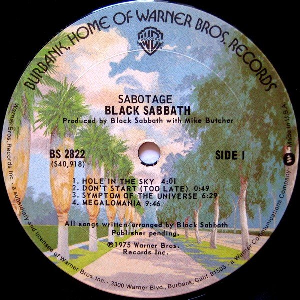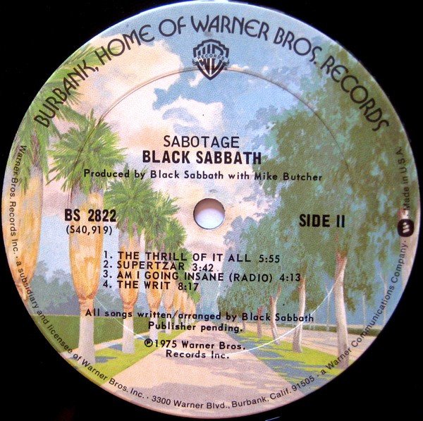 Warner Bros. Burbank "Palm trees" vinyl labels. The Warner/Reprise loss leaders inner sleeve On vinyl labels: All songs written/arranged by Black Sabbath Publisher pending. ℗ 1975 Warner Bros. Records Inc.