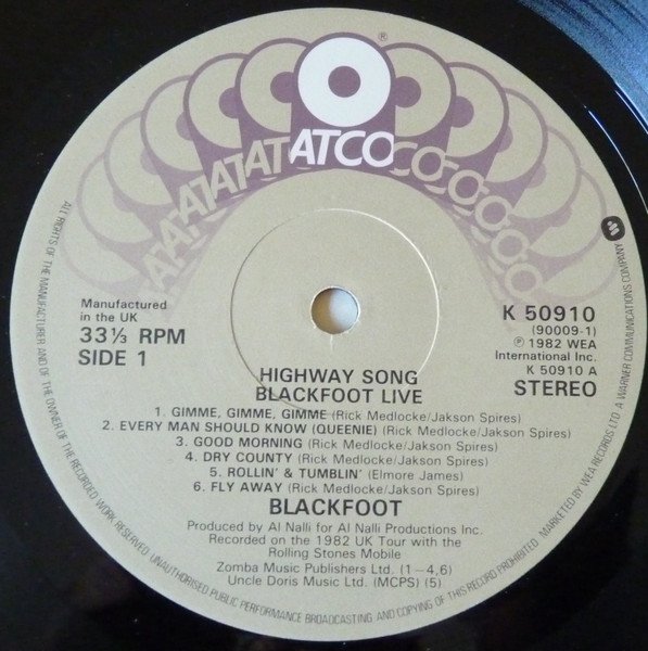 Track B5 adapted from "The Blaydon Races". Recorded on the 1982 U.K. Tour with The Rolling Stones Mobile. Manufactured in the UK. Durations do not appear on this release. Timings via stopwatch. Dedicated to Paul Shorty Medlocke. ℗ 1982 WEA International Inc. Runouts are etched except for TOWNHOUSE which is stamped.