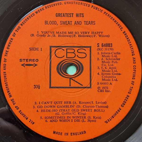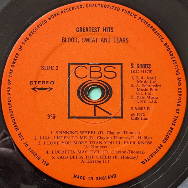 A1 - Jobete Carlin Music Ltd. A2, B3 - A. Schroeder Music Pub. A3, A5 to B4 - April Music Ltd. A4 - Screen Gems Columbia Music Ltd. B5 - Yale Music Corp. Ltd. (P)1972 CBS Inc. Band name on front sleeve: Blood, Sweat & Tears Band name on labels: Blood, Sweat And Tears Catalog number on front and rear sleeve: 64803 Catalog number on labels: S 64803 Additional cataolog numer on labels (in paranthese): KC 31170 Runouts are stamped.