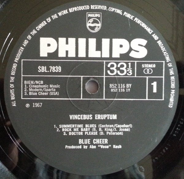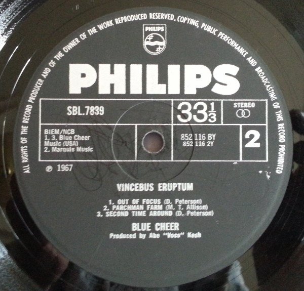 Stereo cover with stereo record (in contrast to [url=http://www.discogs.com/Blue-Cheer-Vincebus-Eruptum/release/4158480]this[/url] mono-cover/stereo-record variant). Recorded at Amigo Studios, North Hollywood, Calif. ℗ 1967 Publishing credits: A1. Cinephonic Music A2. Modern/Sparta A3. Blue Cheer (USA) B1, B3. Blue Cheer Music (USA) B2. Marquis Music