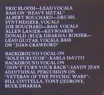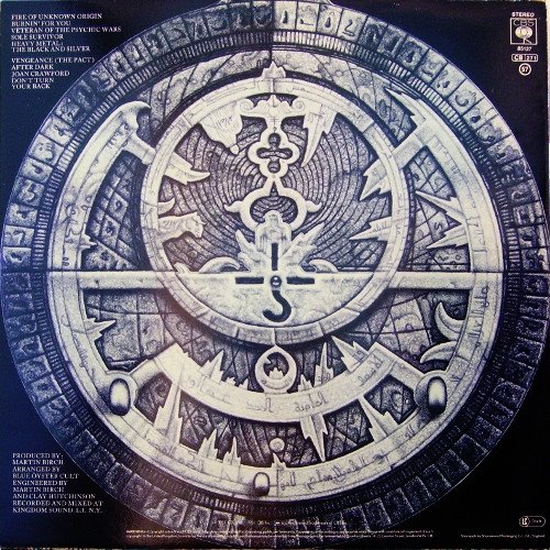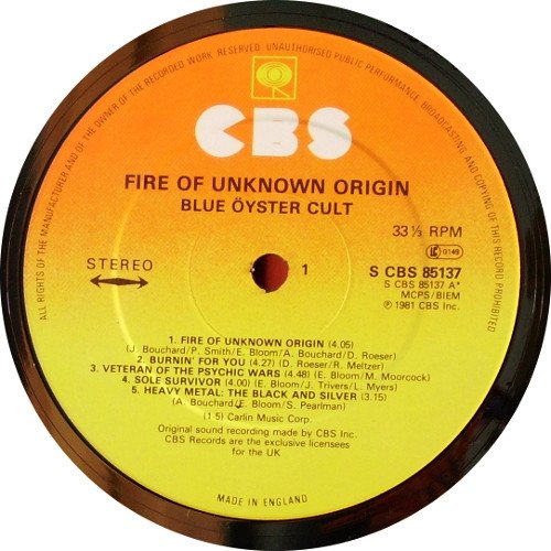 © 1981 CBS Inc. ℗ 1981 CBS Inc. Picture inner sleeve printed with additional credits and a detail of the Greg Scott illustration (front), and adverts for the Blue Öyster Cult catalogue (back). Catalogue numbers: 85137 on the sleeve S CBS 85137 on the labels Back cover courtesy of Inner Traditions Book [a476839] appears courtesy by Epic Records Shorepak by Shorewood Packaging Co. Ltd., England. Made in England. Runouts are stamped except for "CBS·S·8̶6̶1̶3̶5̶·A1 timtom" and "CBS·S·8̶6̶1̶3̶5̶·B1" in Variant 2. Variant 2: 85137 is over the scratched out part. The sole A appears as ∴ = 3 dots in a pyramid.