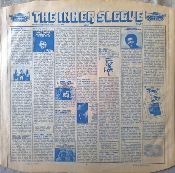 ℗ 1973 CBS Inc. Made in England A1: City Music Ltd A2: Manor Music Co. Ltd. A3, B2, B5: Public Domain A4 Cinephonic Music Ltd. B1, B3: Warner Bros. Music Ltd. B4: Leeds Music Ltd. Shorepak by Shorewood Packaging Co. Ltd., England CBS is a Trademark of the Columbia Broadcasting System Inc. USA Track A1 is mis-titled as "Lilly Of The West" on label. B5 actually written by [a8989990] / [a13760689] (music sometimes also attributed to a certain Marc Williams Ellis.) This song, often misattributed as "traditional" was based on a poem written by Charles Clark. Billy Simon put music to it. The poem was originally published as "A Border Affair" in the June 1907 issue of "Pacific Monthly". It was republished in 1915 by Chapman & Grimes as part of a compilation of Clark's works entitled "Sun and Saddle Leather". The song ended up with several variant lyrics [info taken from 'SecondHandSongs' website.] Inner sleeves may be different (see photos please). Runouts are all stamped.