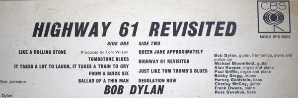 CBS 1st UK pressing - Like a Rolling Stones - Produced By Tom Wilson - Variations On Rear Sleeve Gloss-laminated full-color cover with 3 laminated and overlapped glue-tabs onto un-laminated back cover (aka 'flipback') that has black & white halftone and black text. black box around tracks. Track A4: On sleeve as "From A Buick Six" and on labels as "From A Buick 6" (Which is latter the most common title) "CBS" monogrammed 'eye' logo on both cover front & back - and on labels. Rough-textured' labels. Made in England. Blossom Music. ℗1965 Printed and made by Garrod & Lofthouse Ltd. Patents pending.