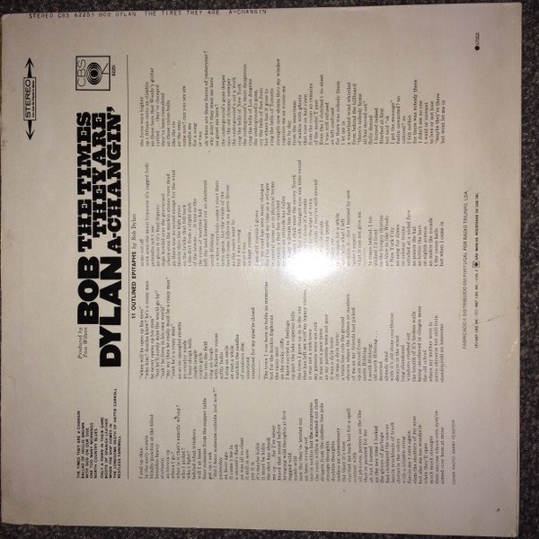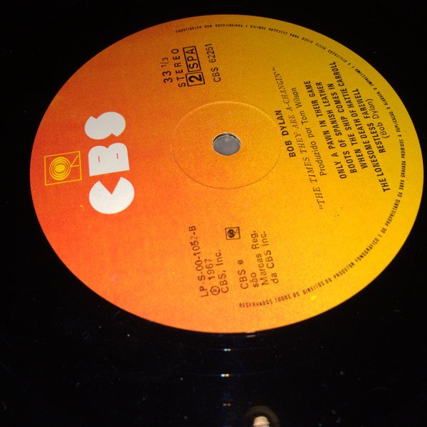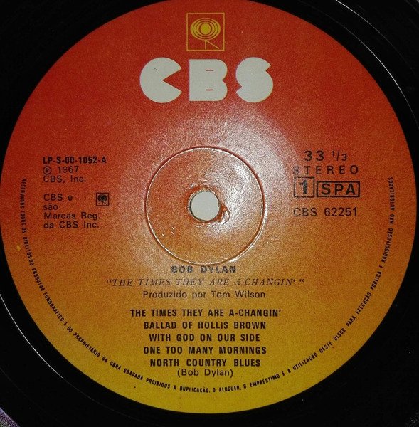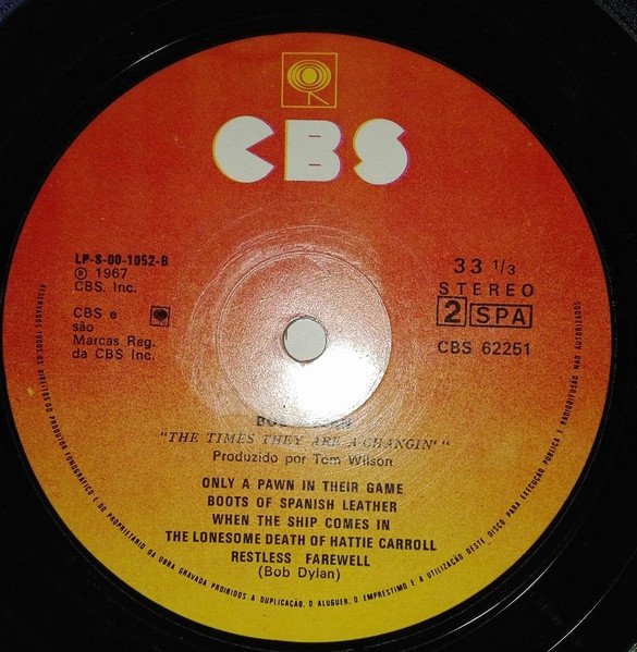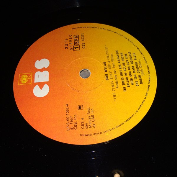 First and only portuguese release. Album was banned in Portugal during dictatorship, ending in 1975. Vertical printing of the album details on the rear sleeve next to the spine; "STEREO CBS 62251 BOB DYLAN THE TIMES THEY ARE A-CHANGIN".