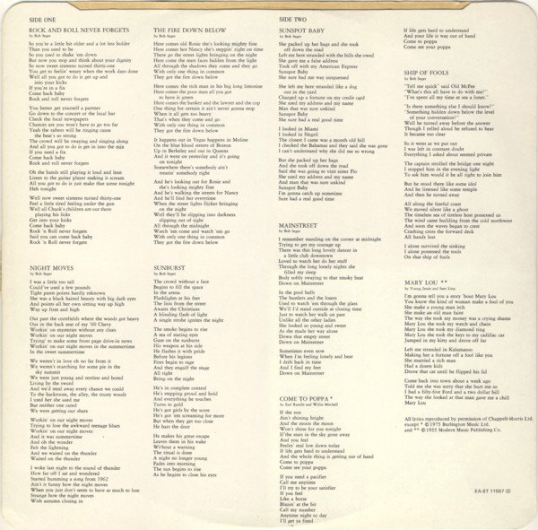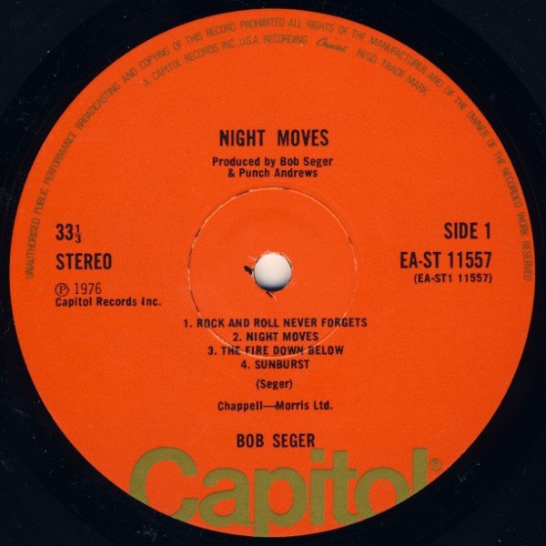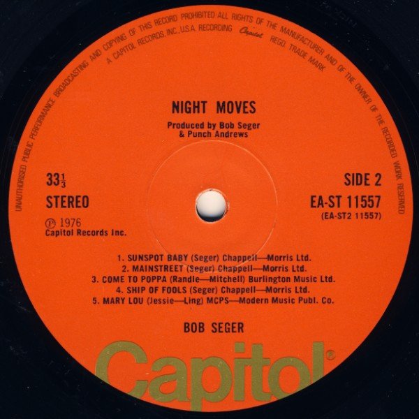 Cover information: Recorded at Muscle Shoals Sound Studios, Alabama (B1, B2, B3, B4) Recorded at Pampa Sound Studios, Detroit, Michigan (A1, A3, A4, B5) Recorded at Nimbus Nine Studios, Toronto, Canada (A2) Mixed at Pampa Sound Studios. ℗ 1976 Capitol Records Inc. EMI Records Ltd Hayes Middlesex England Made and printed in Great Britain 7611 TM Garrod & Lofthouse Ltd Inner Sleeve information: Made of card with rounded corners; front shows the song lyrics with writer credits in full; black and white photo of the artist on back. All lyrics reproduced by permission of Chappell-Morris Ltd. except * © 1975 Burlington Music Ltd. and ** © 1955 Modern Music Publishing Co. (NB * is track B3, ** is track B5) EA-ST 1157 (I) Label information: Artist credit is 'Bob Seger' no mention of 'The Silver Bullet Band' (both labels) Produced by Bob Seger & Punch Andrews (both labels) © 1976 Capitol Records Inc. Publishing information: [A1 to B2, B4]: Chappell - Morris Ltd. [B3]: Burlington Music Ltd. [B5]: Modern Music Publ. Co.