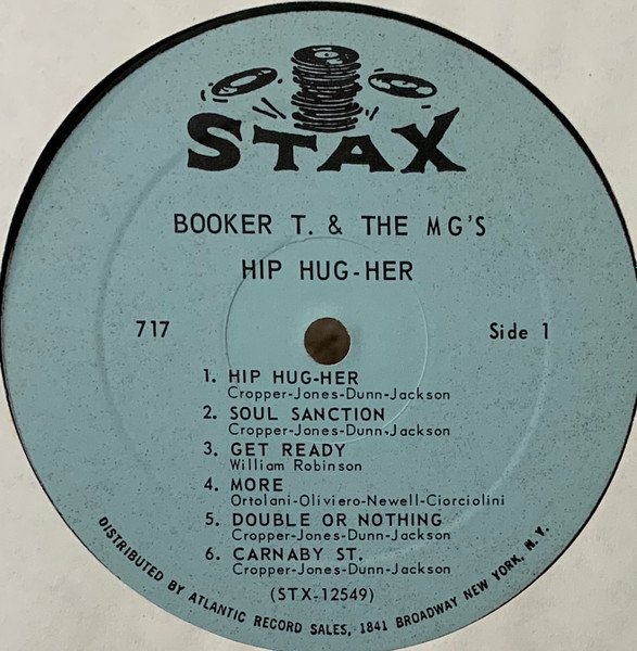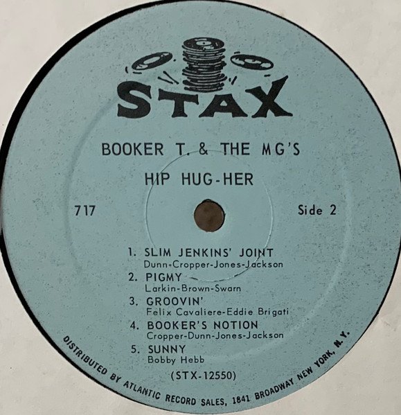 32/70mm two-step pressing ring denotes [l=Presswell] pressing. Issued on light blue labels. Back liner/label variations: - Track B1 titled "Slim Jenkins' Joint" on liner and label. - Tracks A1, A2, A5 to B1, and B4 incorrectly credited to [url=/artist/212701]Allen Jones[/url] on liner instead of [a=Booker T. Jones], updated on other issues. - No fabrication code on liner. Labels: Distributed By Atlantic Record Sales Liner: Distributed By Atlantic Recording Corporation Catalog number on front cover: STAX 717 Catalog number on liner, labels: 717 Track publishers: A1, A2, A5 to B2, B4: East, BMI. A3: Jobete, BMI. A4: E. B. Marks, BMI. B2: Har-Bock, BMI. B3: Slacsar, BMI. B5: Portable, BMI. Some copies have hype sticker on front sleeve: This Album Contains SLIM JENKINS' PLACE and GROOVIN'