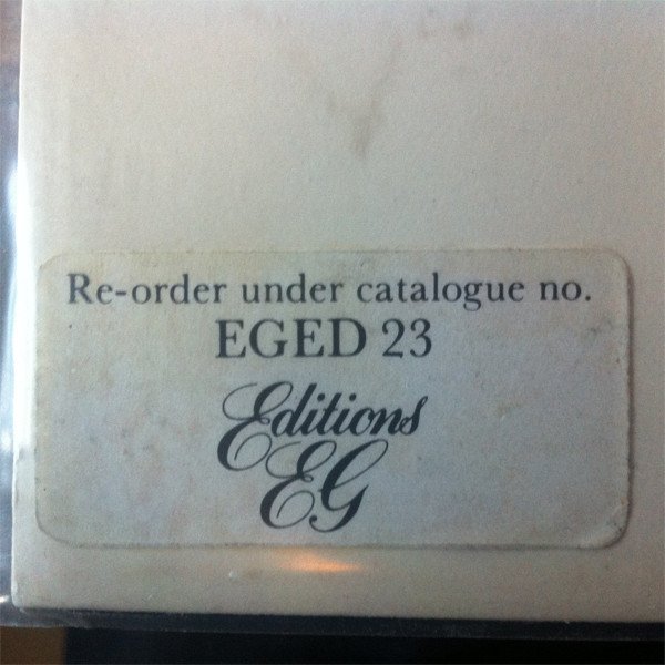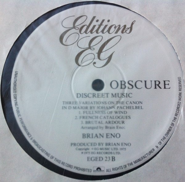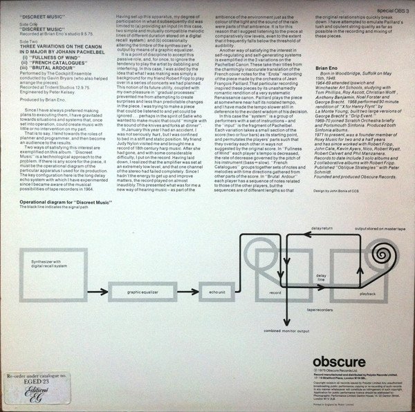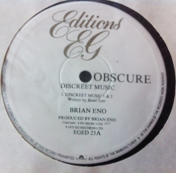 Side One recorded at Brian Eno's studio 9.5.75. Side Two recorded at Trident Studios 12.9.75. Design by John Bonis of CCS On rear cover: Sticker: "Re-order under catalogue no. EGED 23 [Editions EG logo]" special OBS 3 [obscure logo] ℗ 1975 Obscure Records Ltd. Record manufactured and distributed by Polydor Records Limited, 17/19 Stratford Place, London W1N 0BL. Printed in England by Robor Limited On spine: special OBS 3 On labels: [Editions EG logo] OBSCURE Copyright © EG MUSIC LTD. 1975 ℗ 1975 EG RECORDS LTD. EGED 23 A / EGED 23 B [Polydor logo] Reissue consisting of an 'Editions EG' vinyl contained within an altered 'obscure' sleeve, issued likely in the early 1980s. Vinyl label lists title of track A as 'Discreet Music 1 & 2'. No track times present on release. Attention: If stamped (in gold foil) on the back "E'G Box" it is one of the LPs from the 1983 box set "Working Backwards: 1983–1973" (EGBS 2) and does not belong tho the version here.