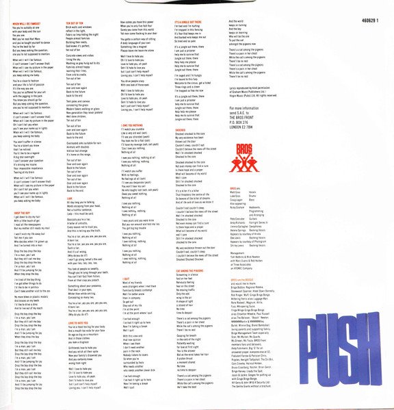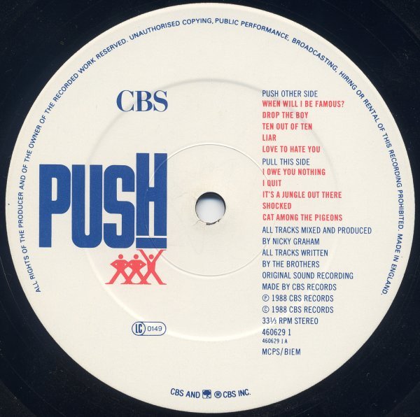 A-Side: Push Side B-Side: Pull Side Recorded at Hot Nights Studios, London, England. Mixed at Sarm Studios (East), London, England. ℗ & © 1988 CBS Records This edition has no publishing credits under Bros logo on label. Another edition has additional publisher: Intersong Music Ltd. Nicky Graham credit is mixed and produced on label, produced on sleeve.