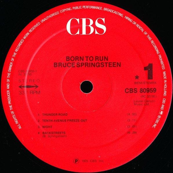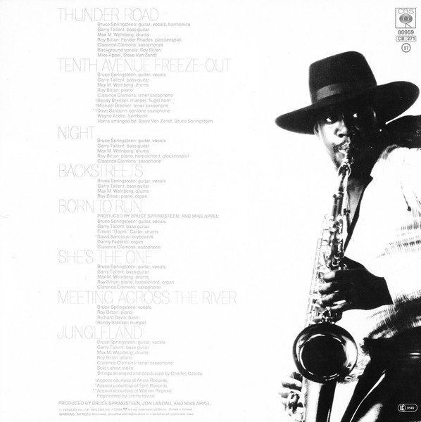 Randy Brecker and Michael Brecker appear courtesy of Arista Records David Sancious appears courtesy of Epic Records Dave Sanborn appears courtesy of Warner Reprise ℗ 1975 CBS Inc. Reissue with red center label used by CBS from around 1985. Gatefold cover with lyrics. Made and printed in Holland. Some have a round sticker on front: "Includes Bruce Springsteen poster". Includes a fold-out poster of Bruce Springsteen.