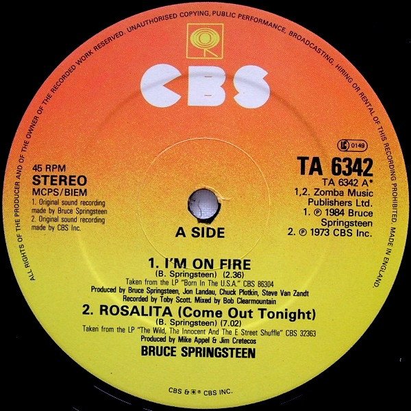 Front cover states: Born In The USA 12" Featuring I'm On Fire Special 4 track 12". A1. Taken from the LP "Born In The USA" A2. Taken from the LP "The Wild, The Innocent And The E Street Shuffle", (P) CBS 1973 B1. Special Version taken from the LP "Born In The USA". Tracks on side B previously unavailable.