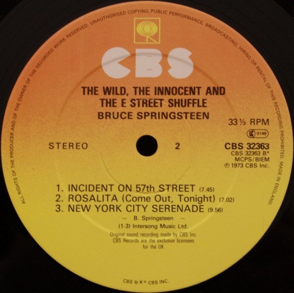 Recorded at 914 Sound Studios, Blauvelt, New YorkMain title as on cover, title on label is "The Wild, The Innocent And The E Street Shuffle"1980s reissue, originally released 1973Text from Label - "CBS Records are the exclusive lisencees for the UK"Some covers have sticker: CBS Nice Price on tape too!!Sunburst labels
