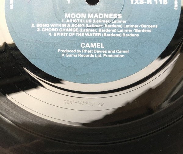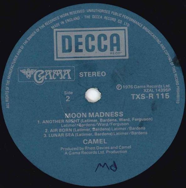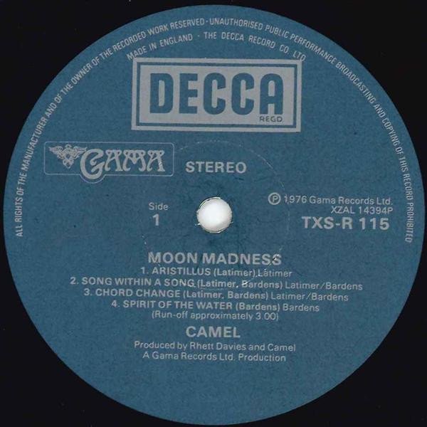 First UK edition. Released in a textured "faux-leather" gatefold sleeve which is more textured than subsequent releases. Inside gatefold is brown tinted. Label side A has the note text in parentheses under the song listing: (Run-off approximately 3.00) Decca polylined inner sleeve.Release date as recorded in the book "Camel, every album, every song" by Hamish Kuzminski. SonicBond, 2021.Printed in England by Robert Stace.Runouts with P-1 suffix and BLAIR.â„— 1976 Gama Records Ltd. A Gama Records Ltd. Production. The Decca Record Co. Ltd. Made In England.Recorded at Basing Street Studios, London, January/February 1976. - [r=3803101] has different labels.Runouts are stamped, except for BLAIR, which is etched.