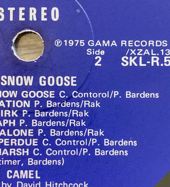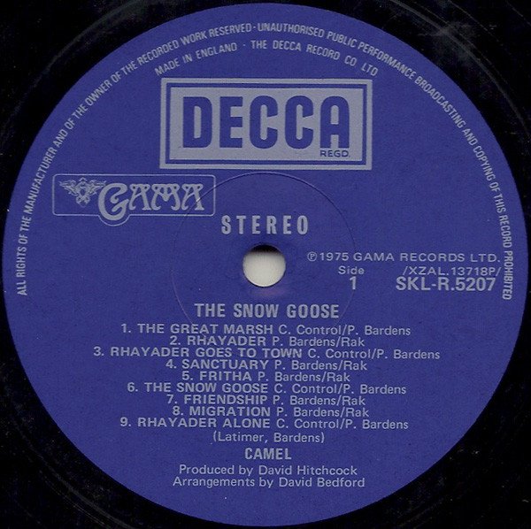 Original UK release in a fully laminated sleeve with pinched spine endings, printed by Robert Stace, including a paper insert with credits/photos printed on one side only by Senol Printing Ltd.. Dark blue Decca labels with typo in B1 publishing, appearing as "C. Contorol" instead of "C. Control". This was corrected on later issues. Polylined standard Decca inner sleeve. First & 2nd cat.# on cover & insert, 3rd & 4th on labels. ℗ 1975, Gama Records Ltd. On front cover: "CAMEL music inspired by The Snow Goose". Sleeve printed in England by Robert Stace. Printed in England by Senol Printing Limited Made in England Publishing: • C. Control/P. Bardens - A1, A3, A6, A9, B1, B6, B7. • P. Bardens/Rak - A2, A4, A5, A7, A8, B2 to B5. Publication date as recorded in the book "Camel, every album, every song" by Hamish Kuzminski. SonicBond, 2021. "The Snow Goose" was inspired by a short story of the same title, written by [Uncredited] [a1709773] in 1941. Runouts are stamped.